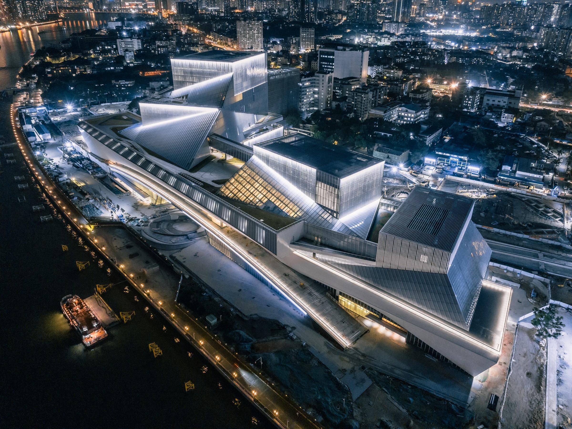 除了造型獨特,白鵝潭大灣區藝術中心的建築用料也別具心思。建築主體首次大規模使用定製釉面陶瓷板和釉面玻璃作為幕牆,陶瓷是中國傳統工藝,同時亦具有良好的隔熱效果。陶瓷幕牆的隱密處裝有投影燈,利用塔樓外牆和大小曲面,就能像巨型電影銀幕一樣播放視頻,帶來視覺的震撼,必將成為新的打卡熱點。