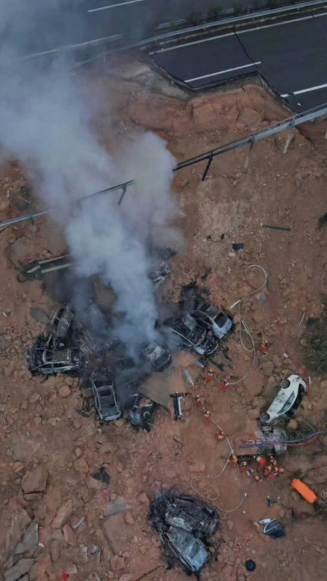 從現場畫面可見,多輛汽車四散掉落滿布沙土的大坑,有部分車輛疑受撞擊起火冒煙。公安指,多數傷者是福建人,部分人為附近居民,開車經過時遇到路陷,傷者多為骨折、內臟損傷。梅大高速雙向車道事發後全面封閉。