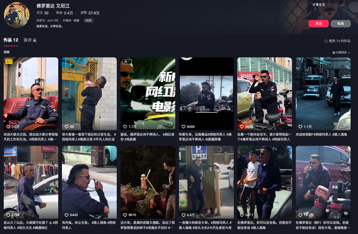 據內媒《新京報》28日報道,這位爆紅的阿布都艾尼江自稱是一名退伍軍人,退伍後在當地糧食局上班,後來當了10年左右的輔警(輔助警察),然後到大巴扎B段當保安。他以「佛羅里達 艾尼江」為名開通抖音平台,不到一週就吸引到2.4萬人追蹤。