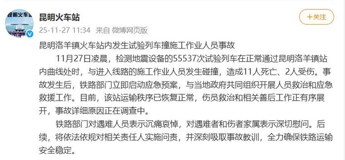 據內媒報導,雲南昆明昆明洛羊鎮火車站內,試驗列車與站內施工作業人員發生碰撞事故,造成11人死亡、2人受傷。據報,經初步調查後,事故原因疑為換軌時工作人員提前上道導致。