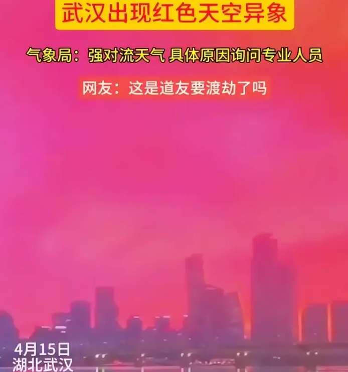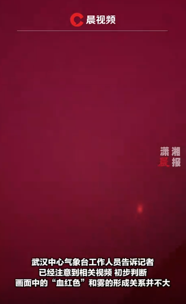 湖南《瀟湘晨報》報道,有民眾當日發現血紅色天空,持續了約一小時。網上流傳從建築物向窗外拍攝的片段,可見外面呈暗血色,且看不清四周。該報向湖北氣象局查詢,指當日天氣一直在變化並有強對流天氣,至於為何天空呈現一片血紅,須聯繫武漢中心氣象台;而氣象台人員則說,「應該不屬於霧的形成」,並指初步判斷,畫面中的血紅色,「可能是拍攝附近有出現紅光」導致。