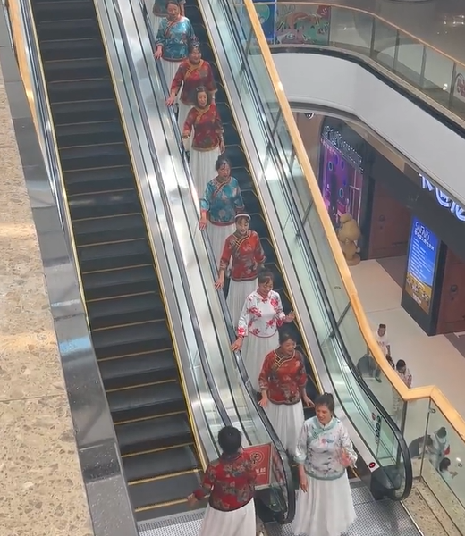 有目擊民眾表示,這些大媽穿著風格統一的傳統服飾,站在手扶梯一側,整齊的下樓並對著鏡頭打招呼,到達下一層樓後,她們又重新折返向上,這時有2名來逛商場的路人也想搭電扶梯,卻被大媽伸手阻攔。影片被放上網後,不少網友留言痛批這樣自私的行為「流水線上的豬」「社會公害」「可以拍攝,但不能影響其他人的使用權利」,該商場也出面回應,如果下次工作人員有看到會上前阻止,也會將此事匯報給上級。