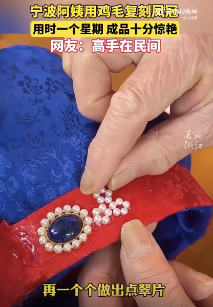 浙江省寧波市一名大媽,只用10天時間,巧手把野雞羽毛變成鳳冠,步驟包括處理雞毛、製作鳳冠架子、貼花片、貼珍珠、掐絲等,做好的鳳冠光彩熠熠,令人驚嘆。