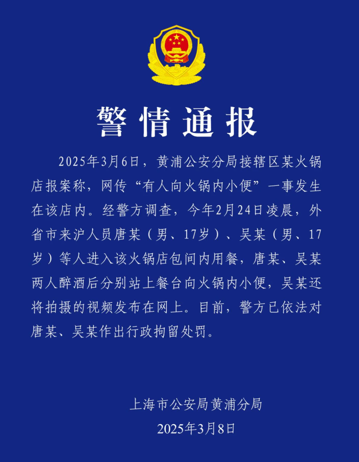 根據通報,經警方調查,今年2月24日淩晨,17歲唐姓男子與17歲吳姓男子等人進入該火鍋店包廂內用餐。唐男與吳男2人醉酒後,分別站上餐台向火鍋內小便。且吳男還將影片PO到網上。通報稱,目前警方已依法對兩人作出行政拘留處罰。