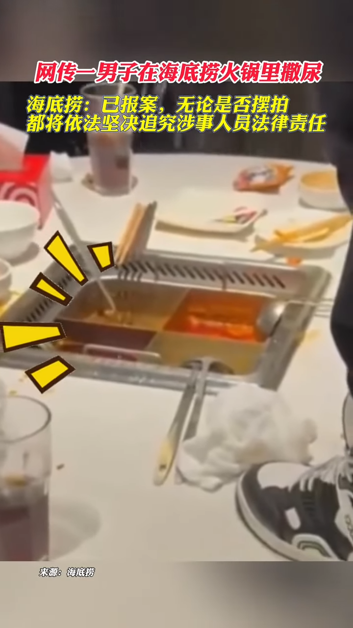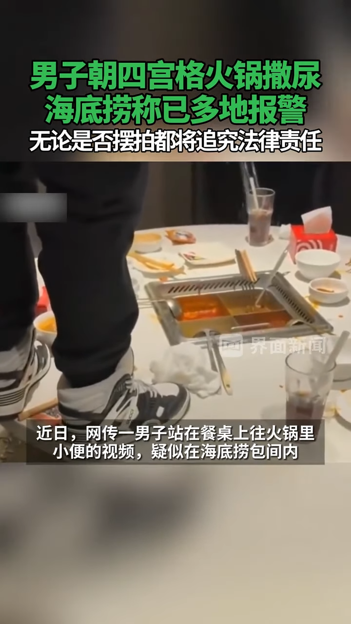 據《極目新聞》等內媒,網上近日流傳一段影片,一名身着黑褲的男子,疑似站在某間海底撈門市的桌子上,對着圓桌上的四宮格火鍋鍋底撒尿,一旁並伴有笑聲,誇張行徑引發熱議。