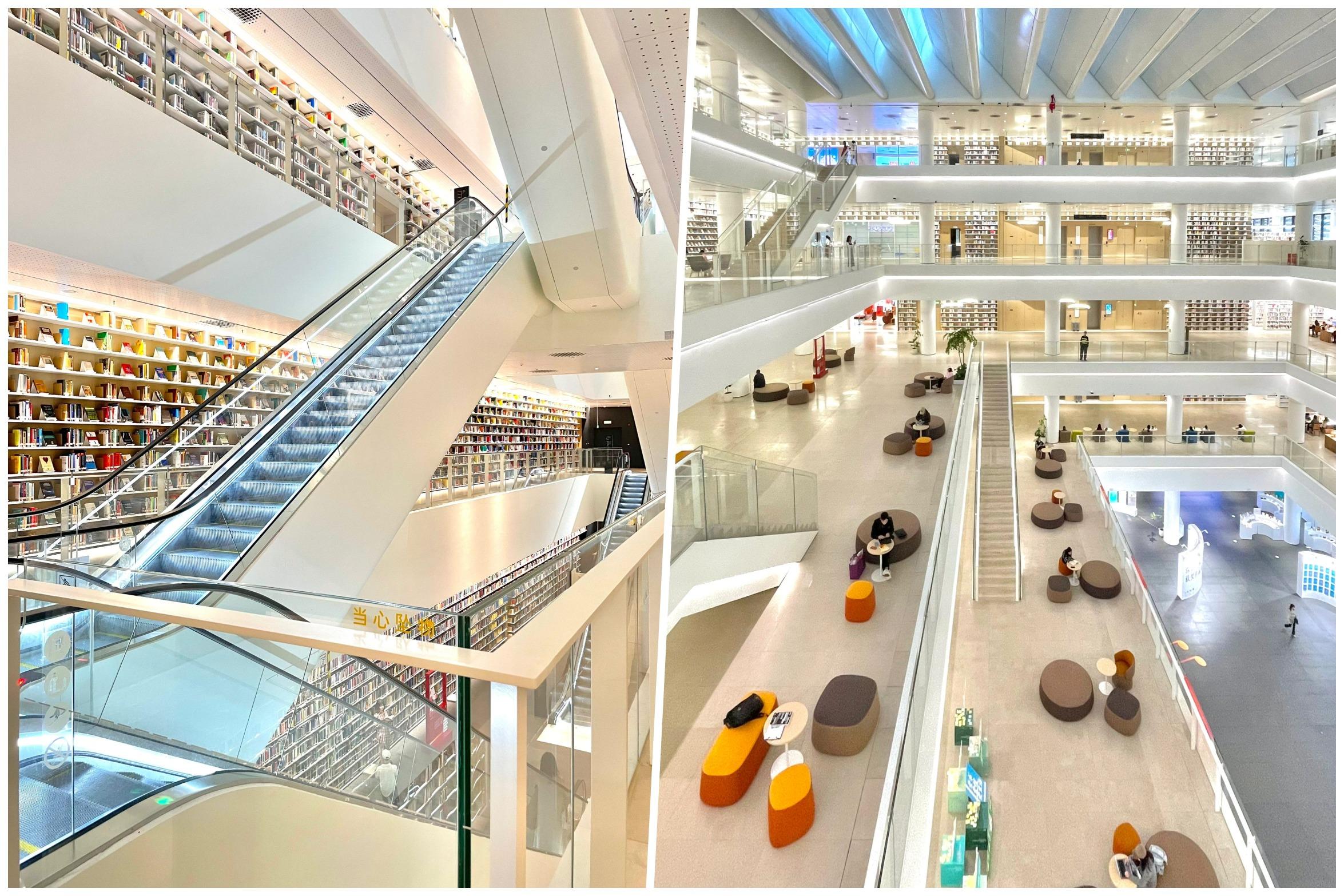 步入館内,環繞中庭而建的6層高「通天書牆」率先映入眼簾,帶來視覺衝擊。整個閲讀空間採用開放式設計,陽光可以直接映入中庭,讓環境變得透亮舒適。