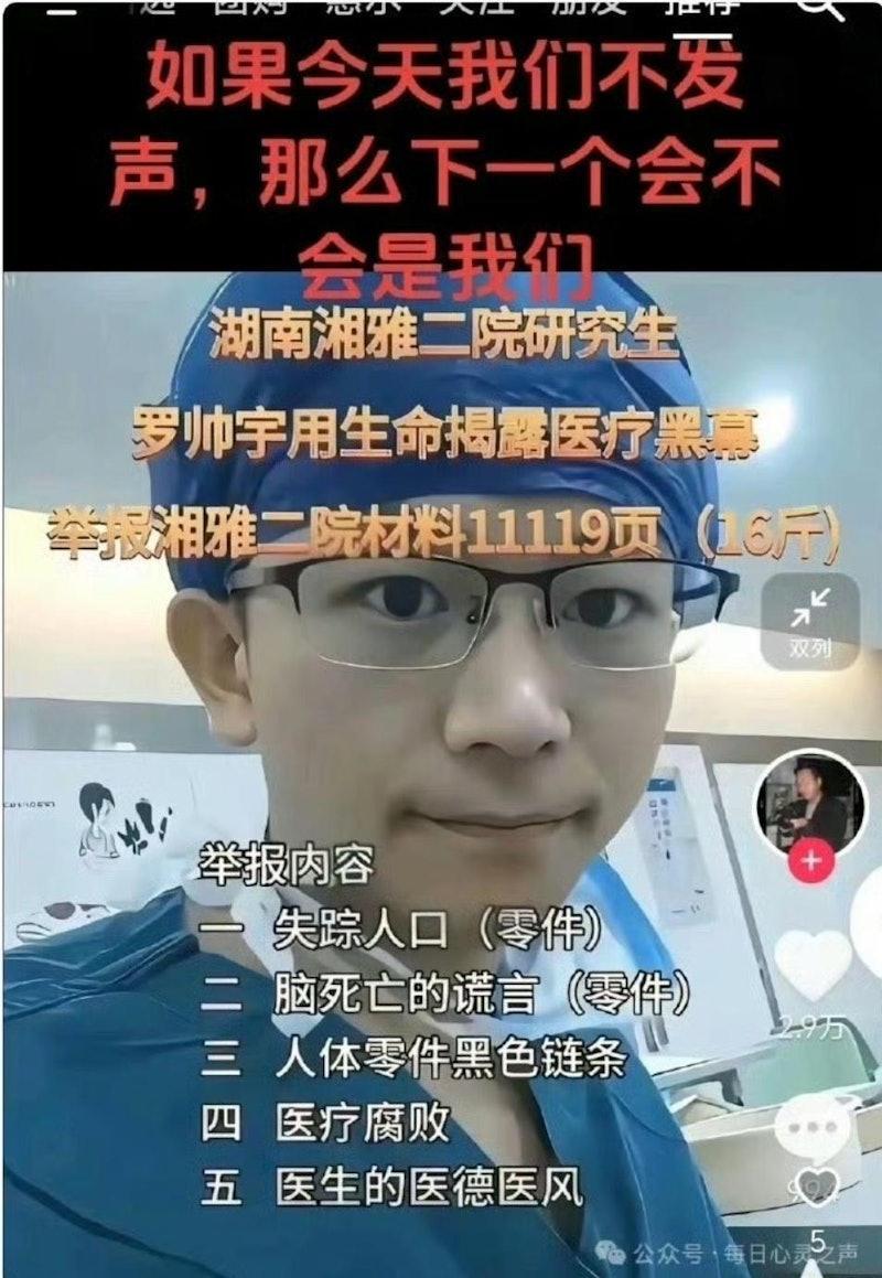 綜合多家內媒報道,死者羅帥宇來自四川省內江,2021年考入湖南省長沙中南大學湘雅醫學院攻讀研究生,並在湘雅二院實習期間,發現該院普外肝膽專科副主任劉翔峰團隊存在非法醫療行為。他整理了20個異常病例,選擇在網上進行舉報。