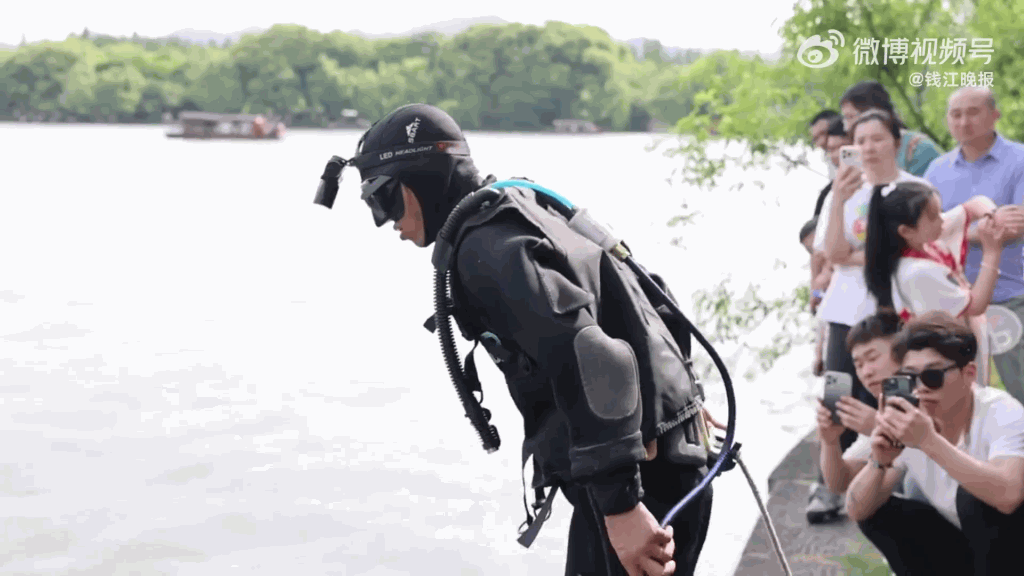 這名40歲的男子來自湖南,原先是做鋼筋工程的,在2022年轉行做起潛水打撈,平時就穿着一件寫有「應急救援」的衣服,在西湖邊幫遊客打撈手機等貴重物品,視物品貴重程度,一單會收取1,500元到2,000元人民幣(約1,700到2,275港元)不等的費用,如果沒有成功撈起的話,價格砍半。