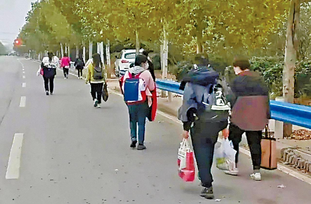 網上流傳不少河南富士康員工,正沿公路徒步返回家鄉。(互聯網)