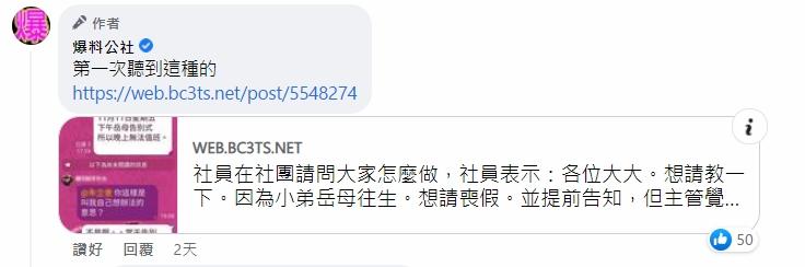 有時打工仔請假真係慘過乞食!台灣一位姓朱網民在Facebook專頁「爆料公社」發文指,因外母離世,日前透過社交軟件「Line」向主管提出在本月11日請喪假出席喪禮,但其他同事都不想增加上班時數,「所以才主管幫忙」,沒想到主管覺得其請假態度有問題,「請問一下大家教教我。該如何處理」。