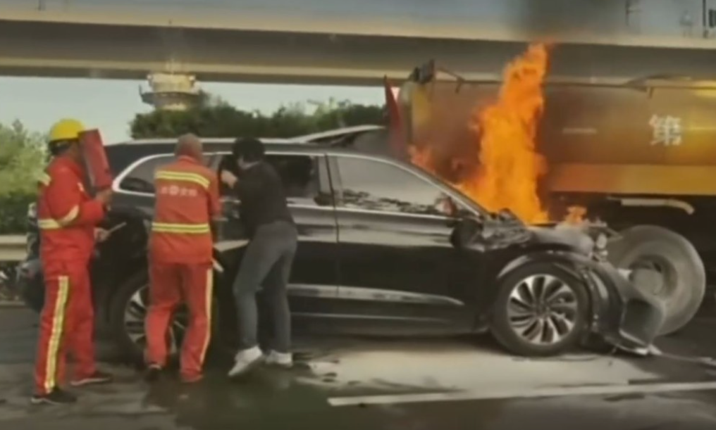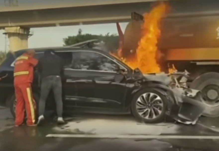 華為電動車問界M7追撞前方的灑水車後起火。(互聯網)