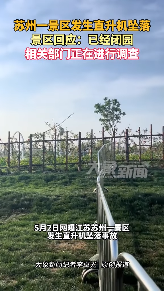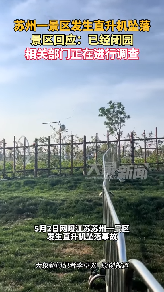 五一假期不平靜!江蘇蘇州一景區驚傳墜機意外,一架觀光用直升機昨日傍晚返航時從10米高空墜落,造成導致機上4人受傷、地面1人死亡,事故原因有待進一步調查公布。