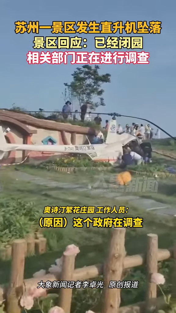 綜合《大象新聞》、《極目新聞》等內媒報道,墜機事件發生在2日17時許,蘇州市吳中區奧詩汀繁花莊園景區,一架R44Ⅱ型直升機(註冊號B-7541)在返航時墜落,導致機上飛行員和乘客4人受傷,經救治後無生命危險,另地面一名遊客來不急躲避,被墜機殘骸擊中身亡。