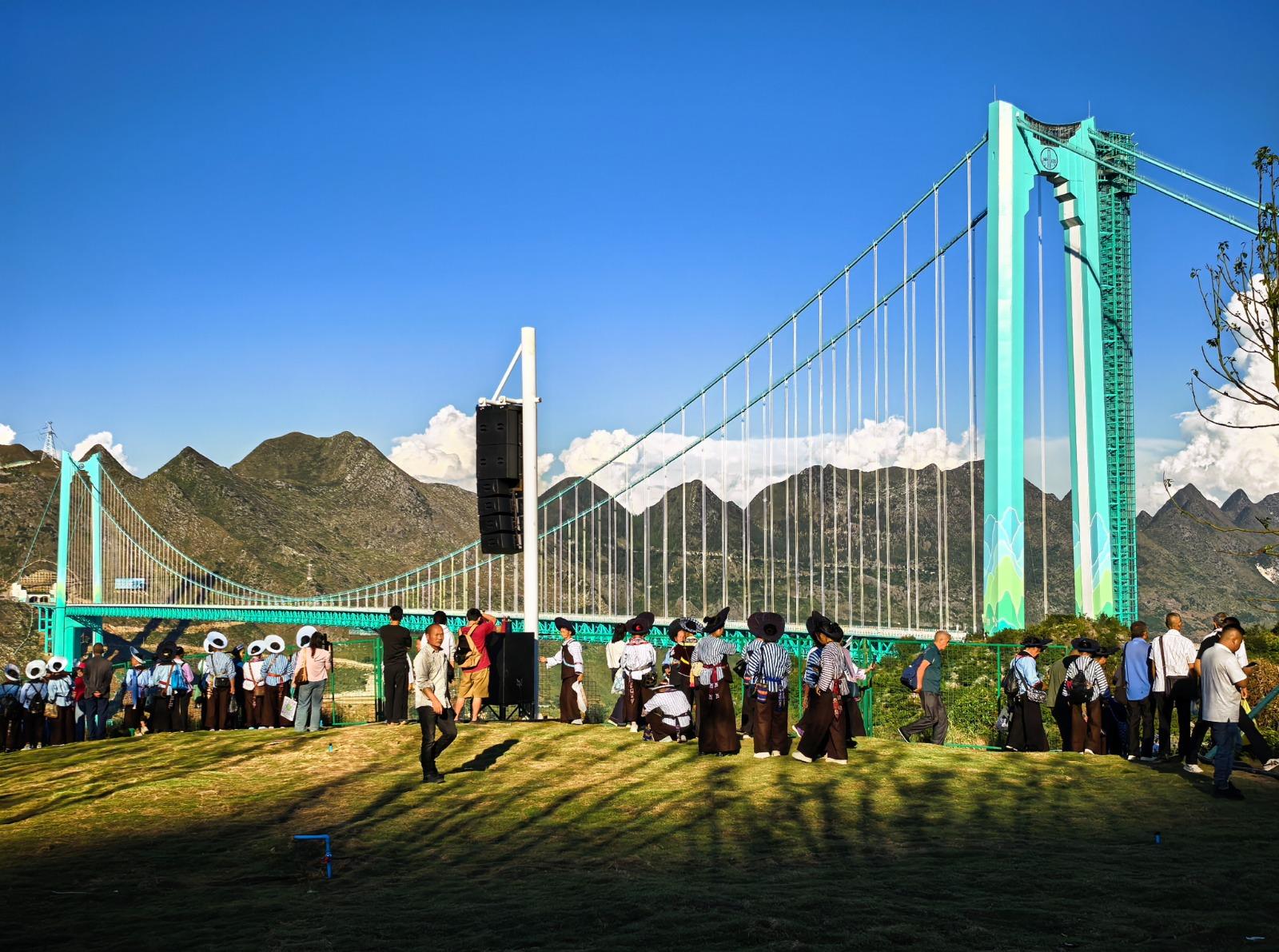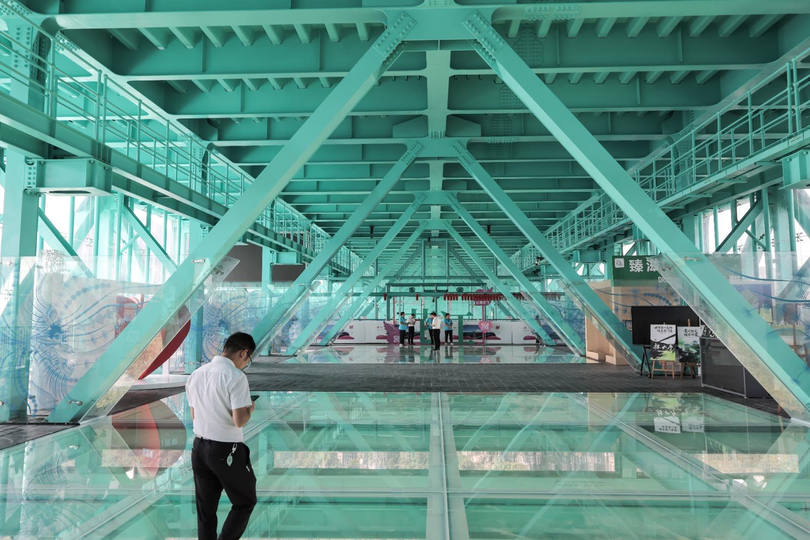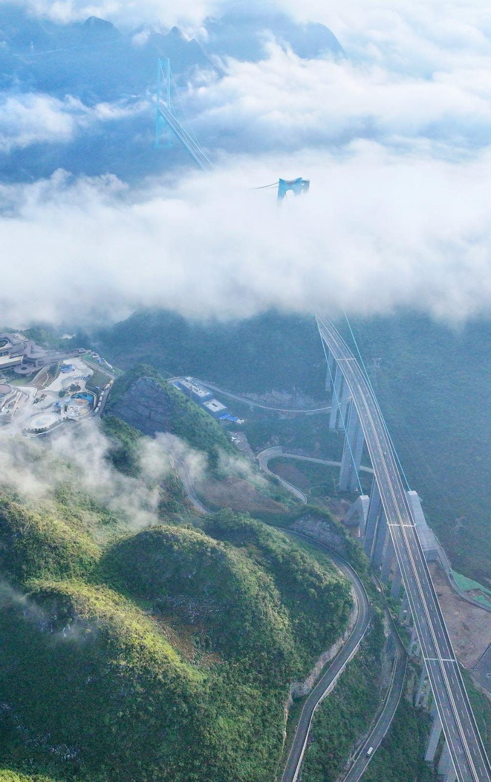花江峽谷大橋設計之初即注重與周邊旅遊資源結合,實踐「橋上做吸引力,橋下做生產力」理念。從北斗系統輔助施工到無人機在高空「穿針引線」,從智能監測到超高強度材料應用,團隊僅用3年時間,在600米高空實現毫米級精度。