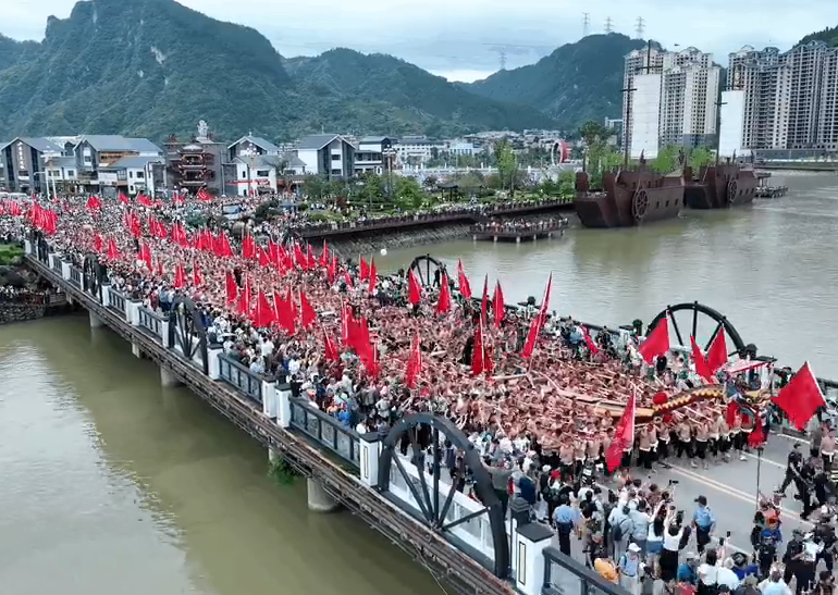 雖然無法親臨現場參加,不過有內地網友航拍了重頭戲「世界最長獨木龍舟巡遊」的震撼畫面分享到網上,2000多名壯漢整齊列隊,頭綁紅色頭巾,上身打着赤膊,齊力扛起世界最長的龍舟,畫面十分壯觀驚人。