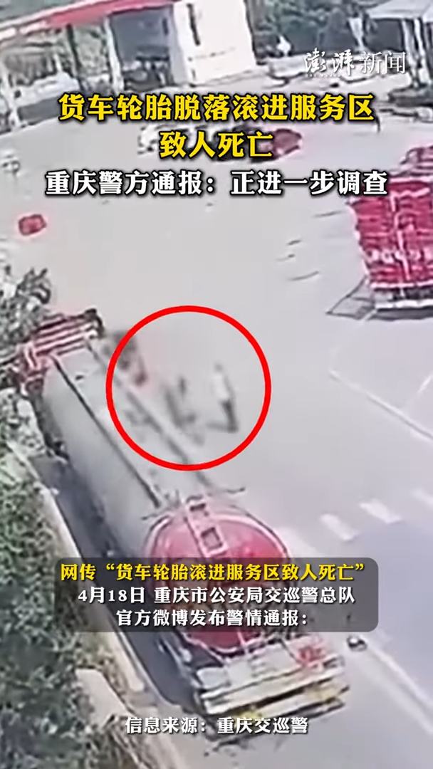 影片當中,一顆脫落的大輪胎在高速公路上高速狂奔,隨後滾入服務區內,撞上了服務區一名行人。有網傳聊天截圖指出,是貨車跑掉了一個輪胎,輪胎跑進重慶的永川服務區後撞死了人。