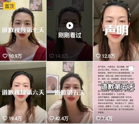 牛娜的道歉影片系列,16日起就神奇地用上文言文,至昨日(18日)已上載第七段道歉影片,這次是以詩道歉。她的每一次道歉都像是一個耳光打在出軌夫臉上,在社群網路引發熱議,令「娜姐重生」一日漲粉20萬。牛娜昨日亦發出鄭重聲明,指近日也有人冒充她抖音,盜用其頭像和作品,她的兩個帳號都被限1個月,並明言她不會私訊網民聊天,呼籲網民注意以防受騙。