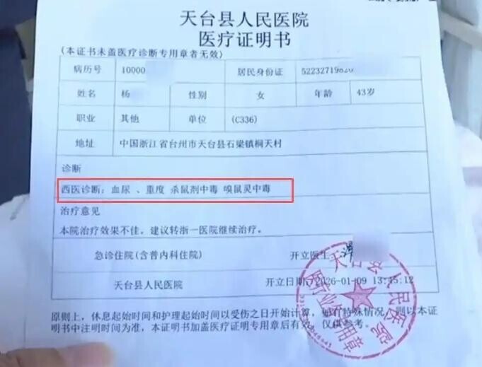 綜合傳媒報道,楊女士表示,自己花費17元人民幣網購8斤娃娃菜,收到當天晚上就煮來食,食完後身體已感到不適,隔天開始流鼻血。根據天台縣醫院1月7日提供的醫療證明書顯示,初步診斷楊女士與丈夫為老鼠藥中毒,導致凝血功能障礙,仍需住院觀察。楊女士曾公開與網店客服的對話紀錄,客服否認食品含有老鼠藥。
