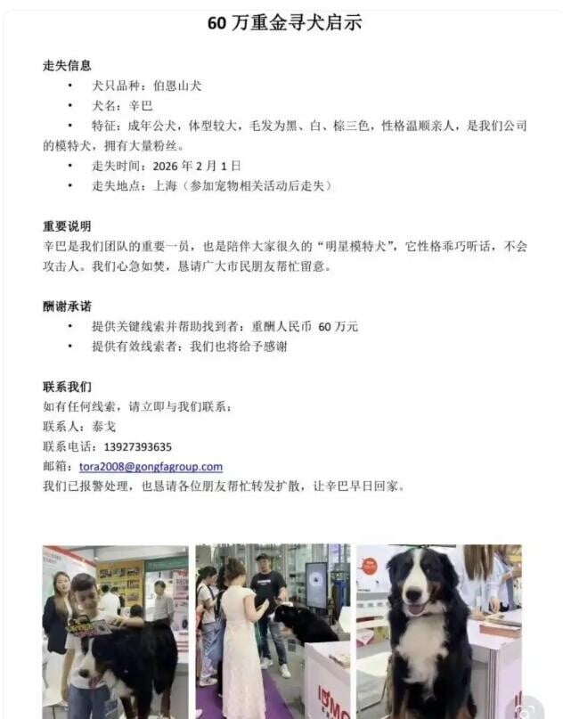 廣東惠州一家寵物智能科技公司日前在發布懸賞啟事,開出60萬元人民幣尋找走失的伯恩山犬,引發網民熱烈討論。公司負責人表示,這隻名為辛巴的犬隻本身價值高,且承載團隊深厚情感,承諾若尋回必定兌現賞金。