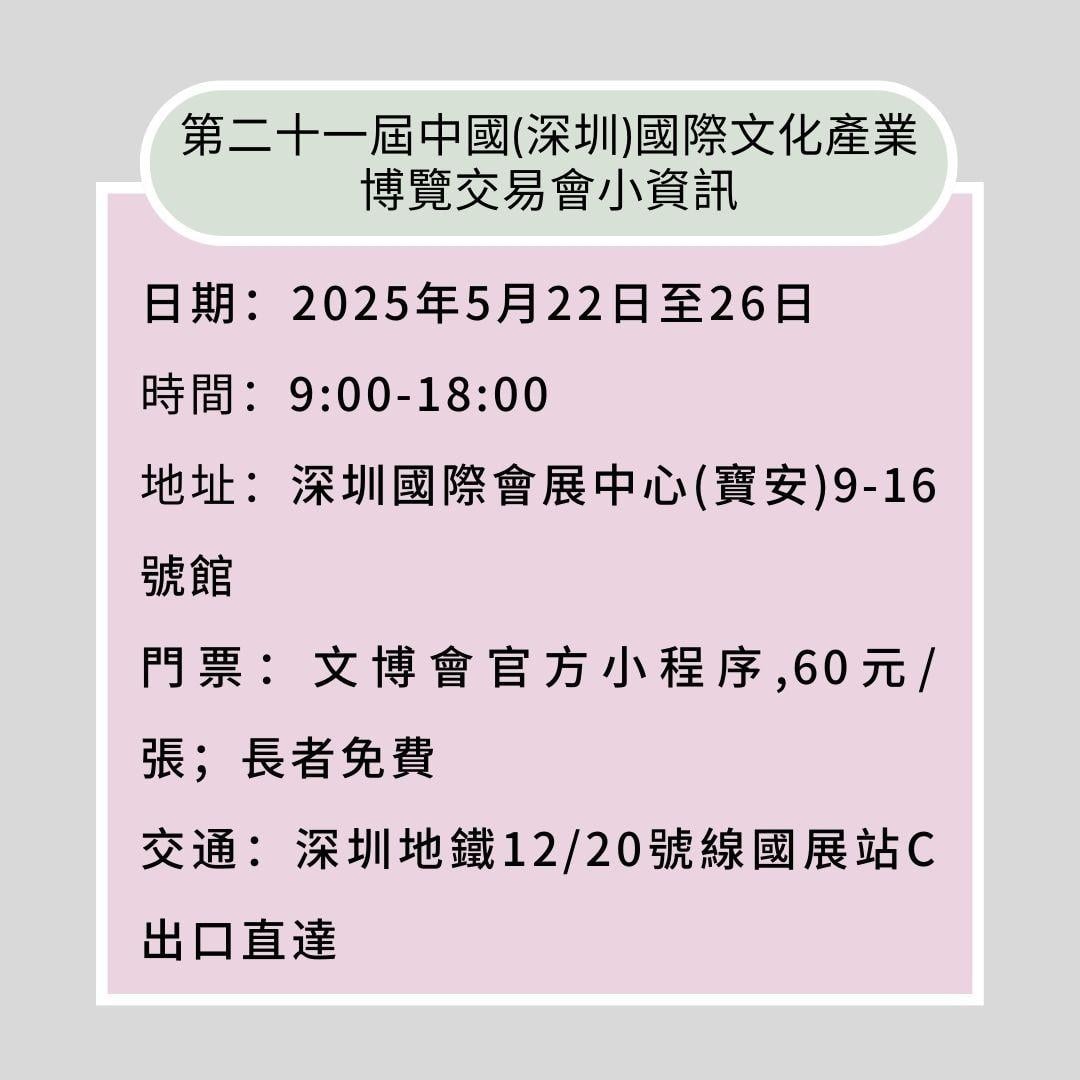 2025年中國(深圳)國際文化產業博覽交易會(以下簡稱文博會)來了!這個被譽為「中國文化產業第一展」的展覽將於5月22日至26日,於深圳國際會展中心舉行。