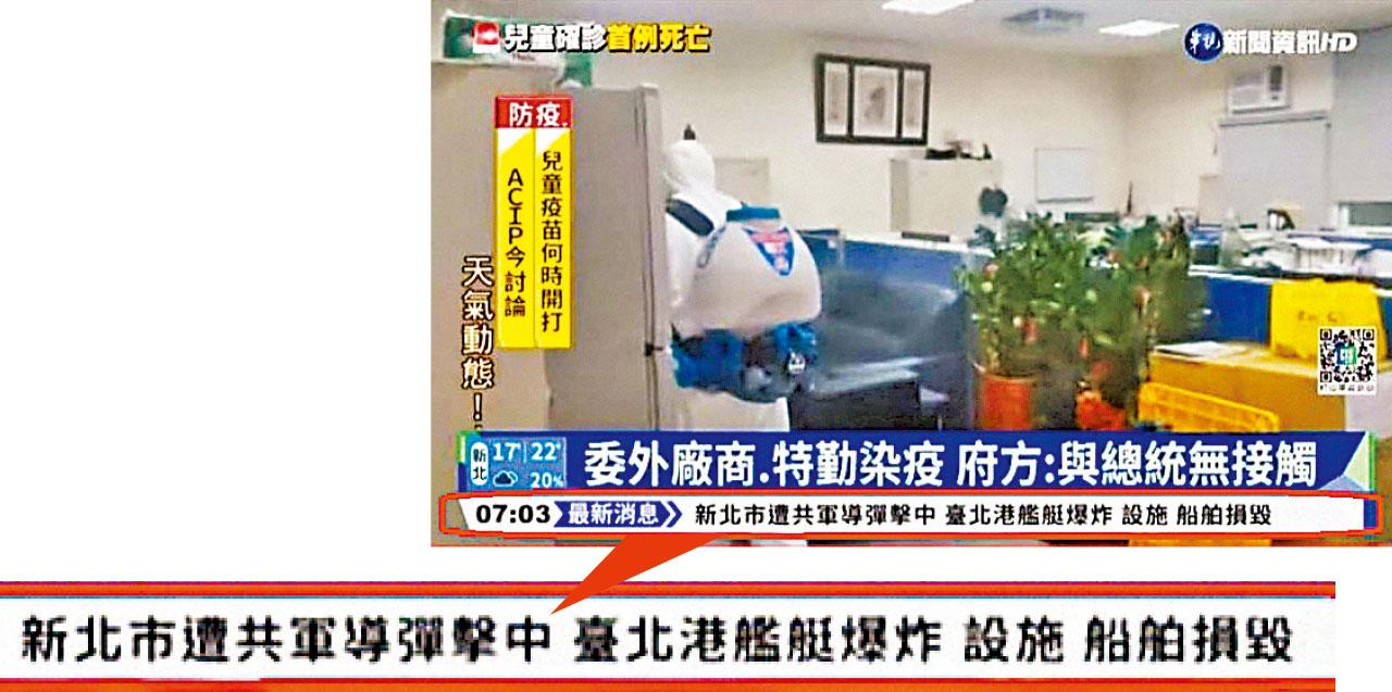 台灣華視新聞昨早7時突然出現多條關於「解放軍進攻新北市」的「最新消息」滾動字幕,包括「新北市遭共軍導彈擊中,台北港艦艇爆炸」(圖)、「總統發布緊急命令,3月6日8時起生效」等,嚇壞不少觀眾。