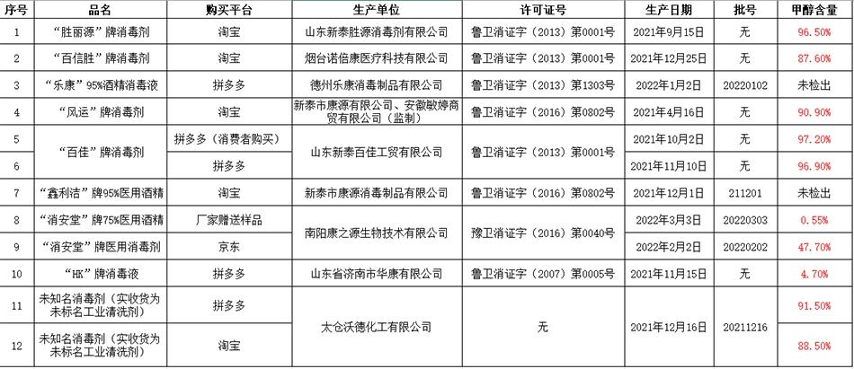 報道又指,記者將該10款消毒劑,連同一支賣家贈送的75%醫用酒精及該支小寧誤喝的消毒劑,送去上海紡織集團檢測標準有限公司化驗,結果僅兩款「95%酒精消毒液」不含甲醇;至於甲醇含量最高的,是小寧誤喝的「百佳」牌,達97.2%,比國家標準中工業酒精甲醇最高含量2,000毫克/升,超標30倍。此外,報道指出,即使相關廠商持有消毒產品生產許可證,並出示檢測報告和衛生安全評價,其消毒劑也驗出47.7%甲醇。