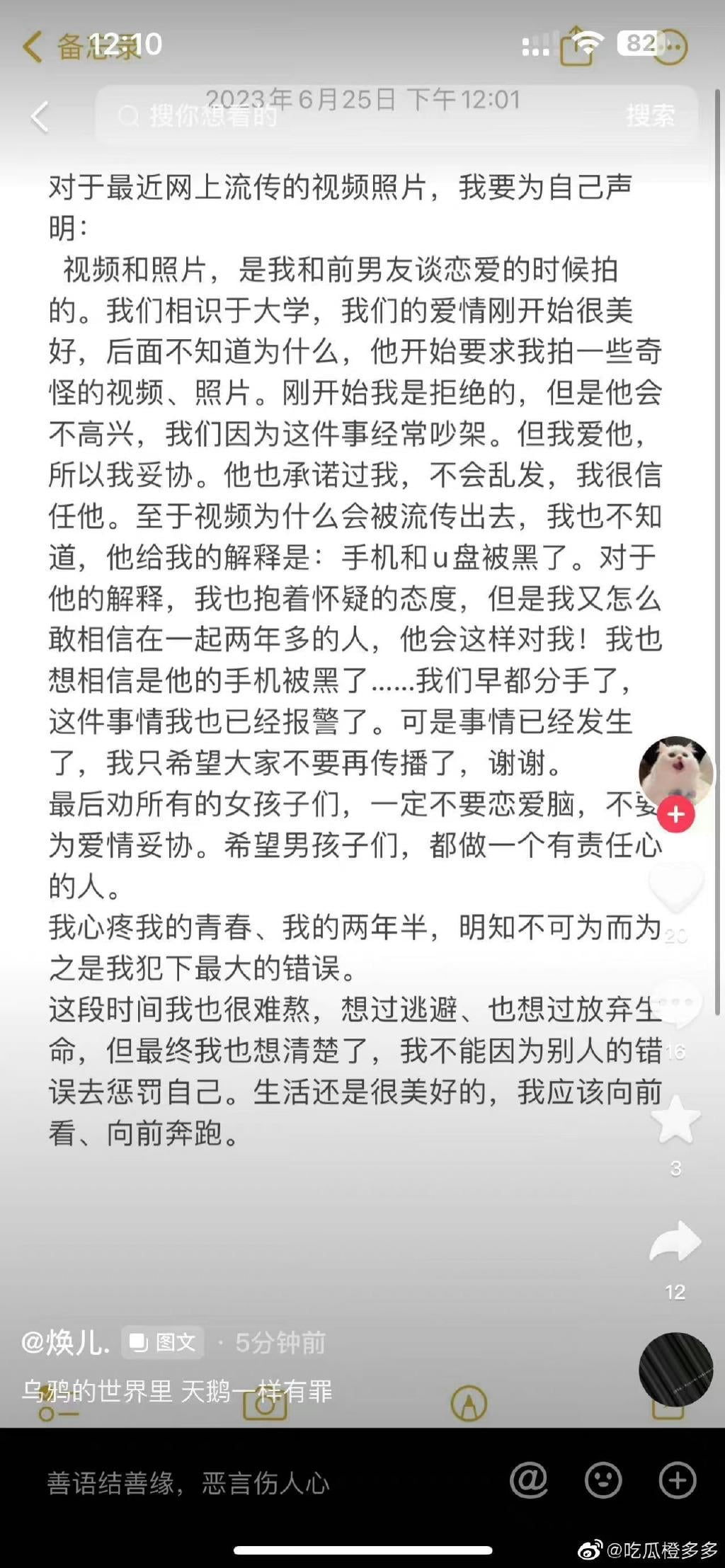 煥兒在抖音承認自己就是外流片中的女主角。