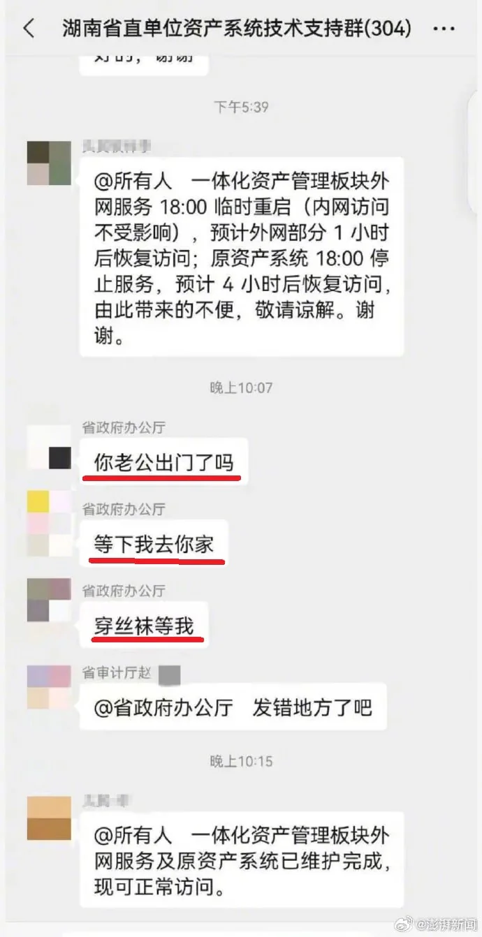 根據網傳「湖南省直單位資產系統技術支持群」的聊天截圖顯示,晚上10時07分,一名稱「省政府辦公廳」的帳號連發3則訊息,「你老公出門了嗎」、「等下我去你家」、「穿絲襪等我」。隨後,名為「省審計廳趙某某」的帳號提醒表示,「發錯地方了吧?」綜合陸媒報道,湖南省行政事業單位資產管理訊息系統運行維護廠商為「北京久其軟件股份有限公司」。湖南分公司負責人徐先生稱,該微信群7月14日晚間因遭到病毒入侵,才會出現不雅訊息,目前已報警處理。