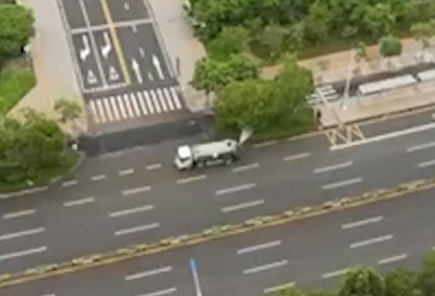 下了一夜雨後,街道上仍有灑水車在工作。(圖/翻攝星視頻)