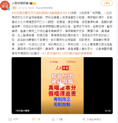 《人民日報》強調真唱是演藝人員的本分。(圖/翻攝自人民日報 微博)