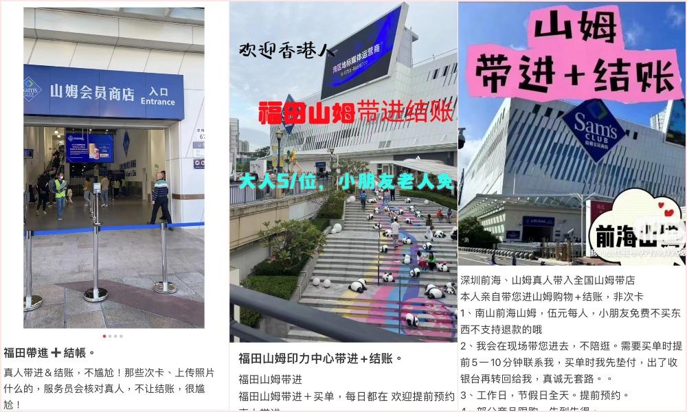 持有山姆超市會員卡的會員,一般可以攜帶親友進入,只要人數不要太多的話,超市職員是不會阻止的。於是在社交平台上,這成為一項網友自發的收費項目,有人以「山姆帶進」為題製作貼文,提供「帶進」服務。進入山姆超市之前,先通過該社交平台給「持卡人」私訊,雙方約定見面地點。見面後,先交「帶進費」,一般是每人五至十元人民幣不等,小孩免費。帶進後,持卡人便離開,讓網友自行購物。付款時,網友再私訊或致電給持卡人回來結賬,其後網友再以電子支付或現金,將費用交給持卡人。這樣,市民即便不是會員也能購物,有些持卡人還接受港元支付。而對於持卡人來說,可以賺到「帶進費」,又能賺進積分。不過不足之處是,當產品出現問題時,持卡人可能不會幫忙退貨,或者在需要售後服務或維權時,可能存在風險。