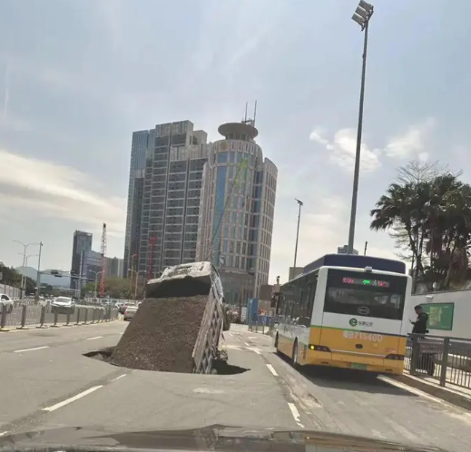 下午1時許,市民張先生向記者表示當時正駕車前往公司,在途經龍崗區龍城大道珠江廣場時,看到一輛泥頭車尾陷在坑裡。張先生指,當時司機已經離開司機位,車還掛在洞中。現場照片可見大洞橫跨兩條行車綫,泥頭車貨斗上載滿碎石。