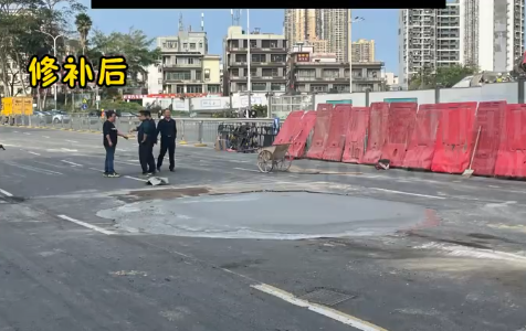 近4時左右,記者看到該路面已填補完畢,工作人員已清掃完路面,惟車道暫時封閉,並用紅色隔板圍封,塌陷原因目前還在調查中。
