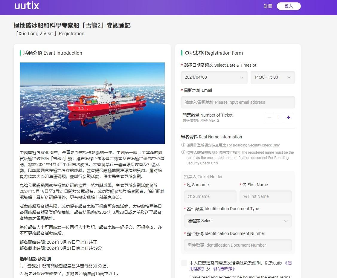 「雪龍2」號訪港可讓市民瞭解國家在極地研究的科研技術,並可親身登船體驗科研人員在船上的生活。圖為「雪龍2」參觀報名網站頁面。(圖片來源:uutix)
