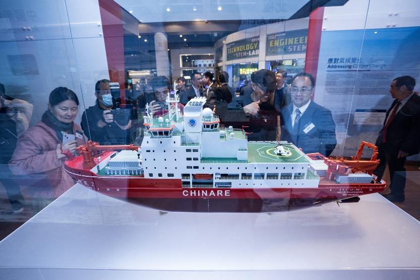 香港科學館舉行「極地科研與氣候變化」展覽,觀眾參觀「雪龍2」號科考船1:100比例模型。(圖片來源:視覺中國)