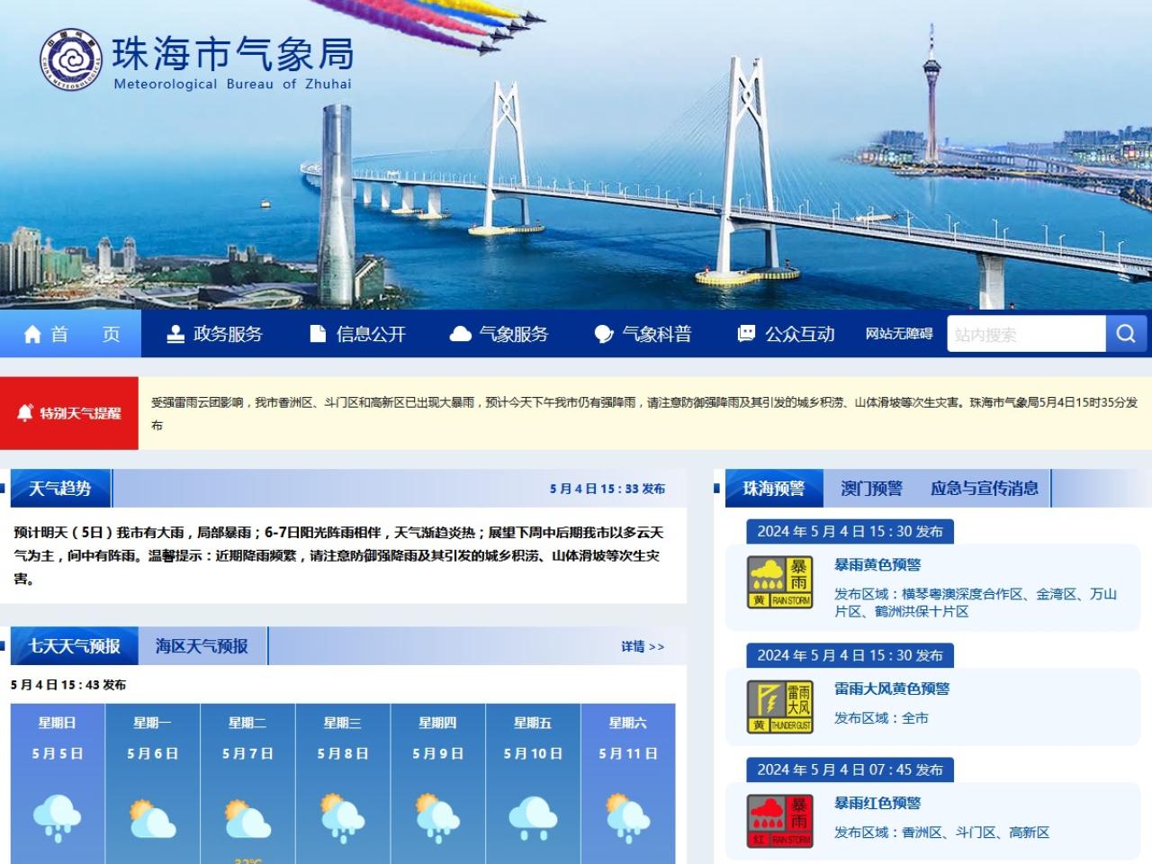 廣東部分地區暴雨持續,在珠海,市氣象台中午將香洲和高新區暴雨預警信號升級為紅色,斗門區暴雨紅色預警信號就繼續生效,當局提醒要特別注意防禦強降雨及其引發的城鄉積澇和山體滑坡等次生災害,市民非必要不出門。