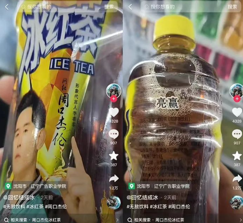一款名為「亮贏」的冰紅茶,包裝上印有酷似「周杰倫」的形象,並且標註為「央視廣告品牌」,瓶子仿似康師傅紅茶。不過原來委託生產這款飲料的公司為達利園飲品(遼寧)有限公司,而包裝圖上的代言人實際上是內地網紅「周口杰倫」,原名為李非非