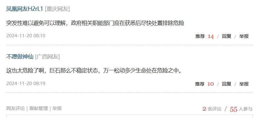 但網友認為施工可以理解,但必須考量居民生活與安全,「這也太危險了啊,巨石那麽不穩定狀態,萬一鬆動,多少生命處在危險之中。」