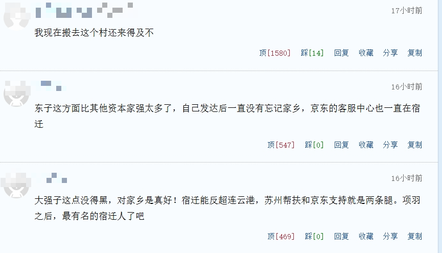 網友打趣表示:「我現在搬去這個村還來得及不」;「東子這方面比其他資本家強太多了,自己發達後一直沒有忘記家鄉,京東的客服中心也一直在宿遷」;「大強子這點沒得黑,對家鄉是真好!(他是)項羽之後,最有名的宿遷人了吧。」