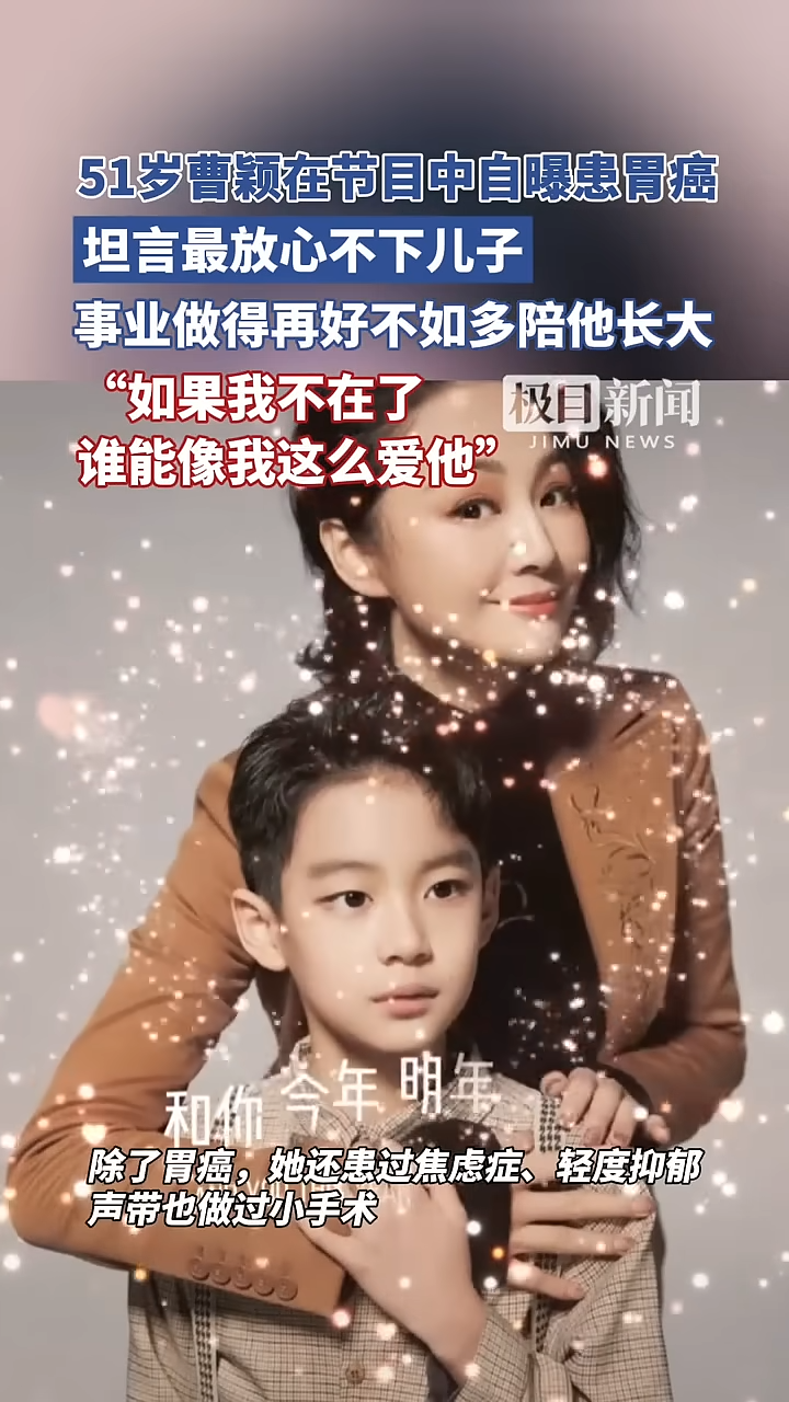 《極目新聞》報道,節目中曹穎還透露,她除罹患胃癌,還曾罹患焦慮症和輕度抑鬱症,聲帶也接受過小手術,她坦言:「其實我不是超人,只是被迫變得堅強。每個晚上,我都要說服自己撐下去。」她並感慨表示:「我真的明白了,再多的掌聲,都比不上孩子的一個擁抱。」