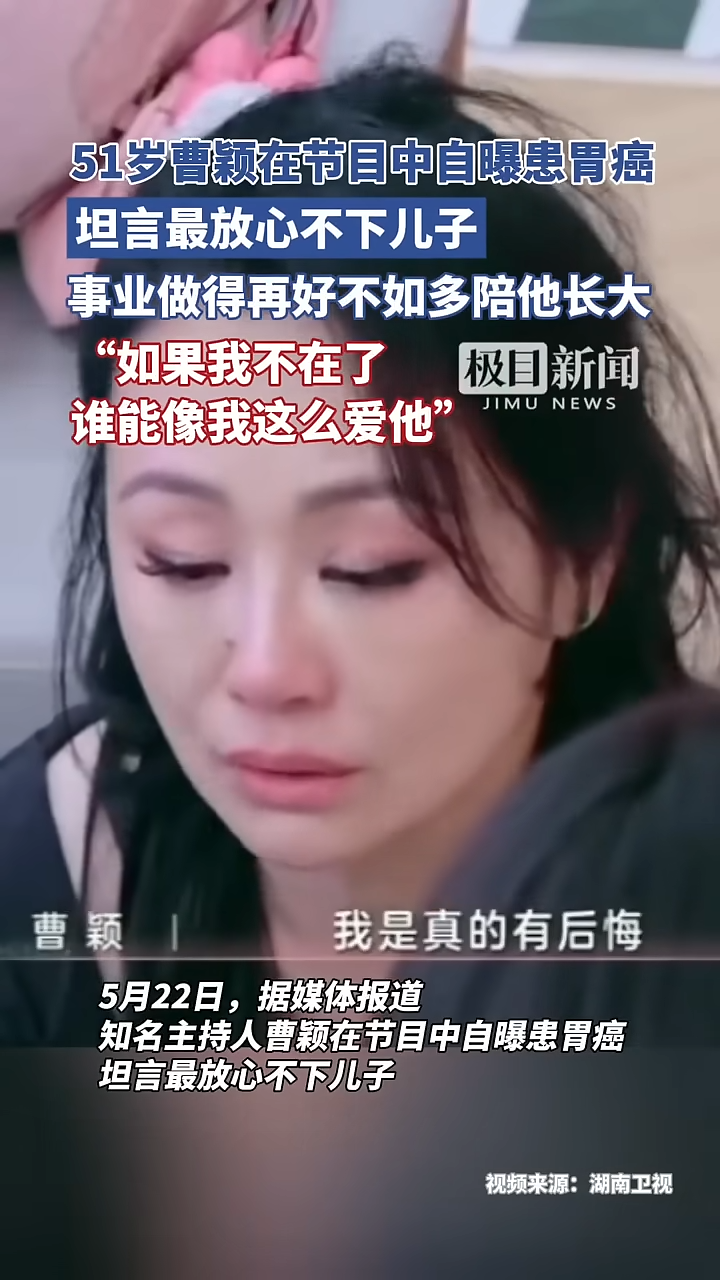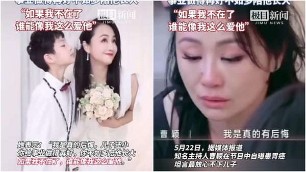 內地知名女主持人曹穎驚傳罹患胃癌,她近日在一個節目中,自曝罹患胃癌,她坦言,最讓她牽掛的不是事業,而是年幼的兒子:「我是真的後悔,兒子還小,你給事業做得再好,也不如多陪他長大。」消息曝光網友唏噓不已。
