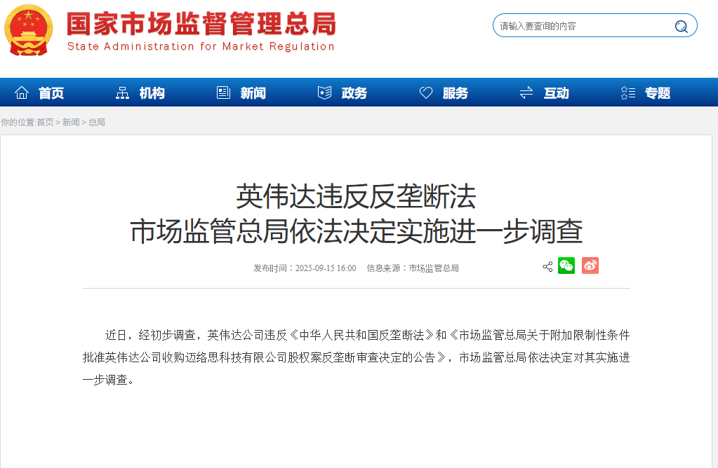 國家市場監管總局昨日(15日)表示,經初步調查,輝達(內地稱:英偉達,Nvidia)違反《中華人民共和國反壟斷法》和《市場監管總局關於附加限制性條件批准輝達收購邁絡思科技有限公司股權案反壟斷審查決定的公告》,市場監管總局決定對輝達實施進一步調查。