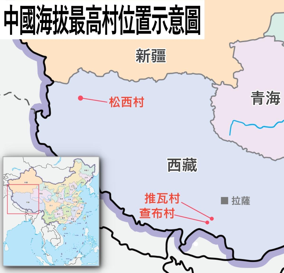 這些村莊海拔有多高?說法很多,《中國日報網》一篇題為「西藏首個極高海拔農牧民眾康養中心投入使用」之報道,提到入住該中心的「均來自海拔5,080公尺(米)以上的普瑪江塘鄉的查布、沙空、薩藏、措果四個村」。