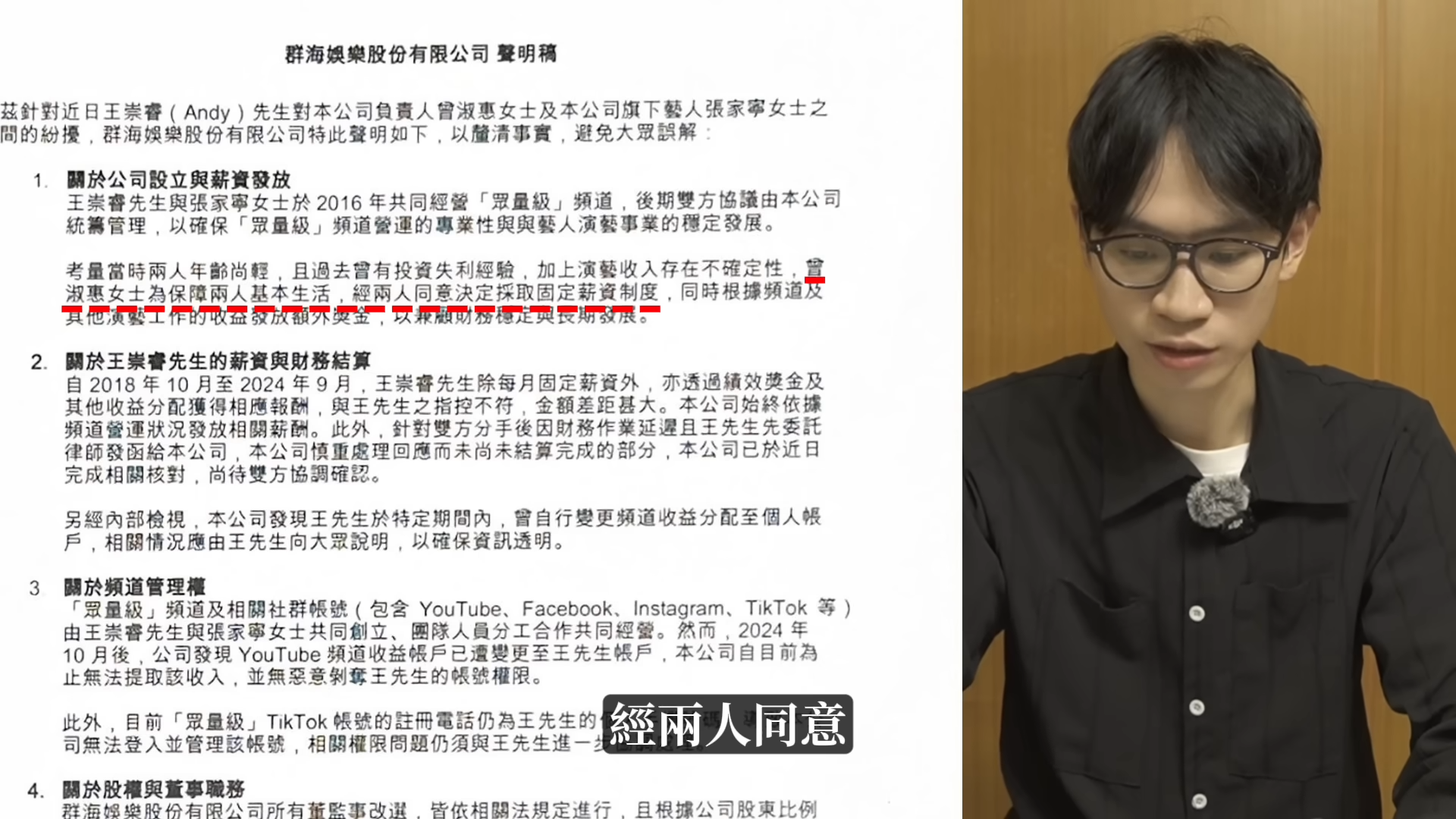 Andy今天凌晨對家寧的6點聲明一條一條列出並回擊,眼神相當堅定,家寧說自2018年10月至2024年9月,Andy每月都有固定薪資,還有績效獎金及其他收益。Andy反駁:「為何公司設立股權您是佔50%呢?而不是我跟張家寧各佔50%,最後我只佔25%,現在您說成我只是借名登記股東的員工?」