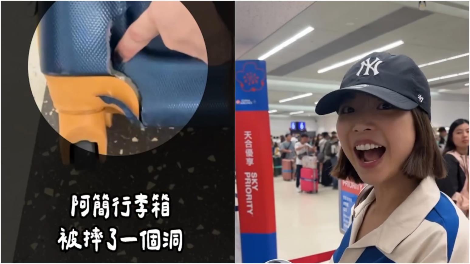 YouTuber一隻阿圓分享搭飛機行李喼被摔壞的狀況,沒想到航空公司竟然幫忙換一個新的,讓她好驚訝。(「一隻阿圓」Threads)