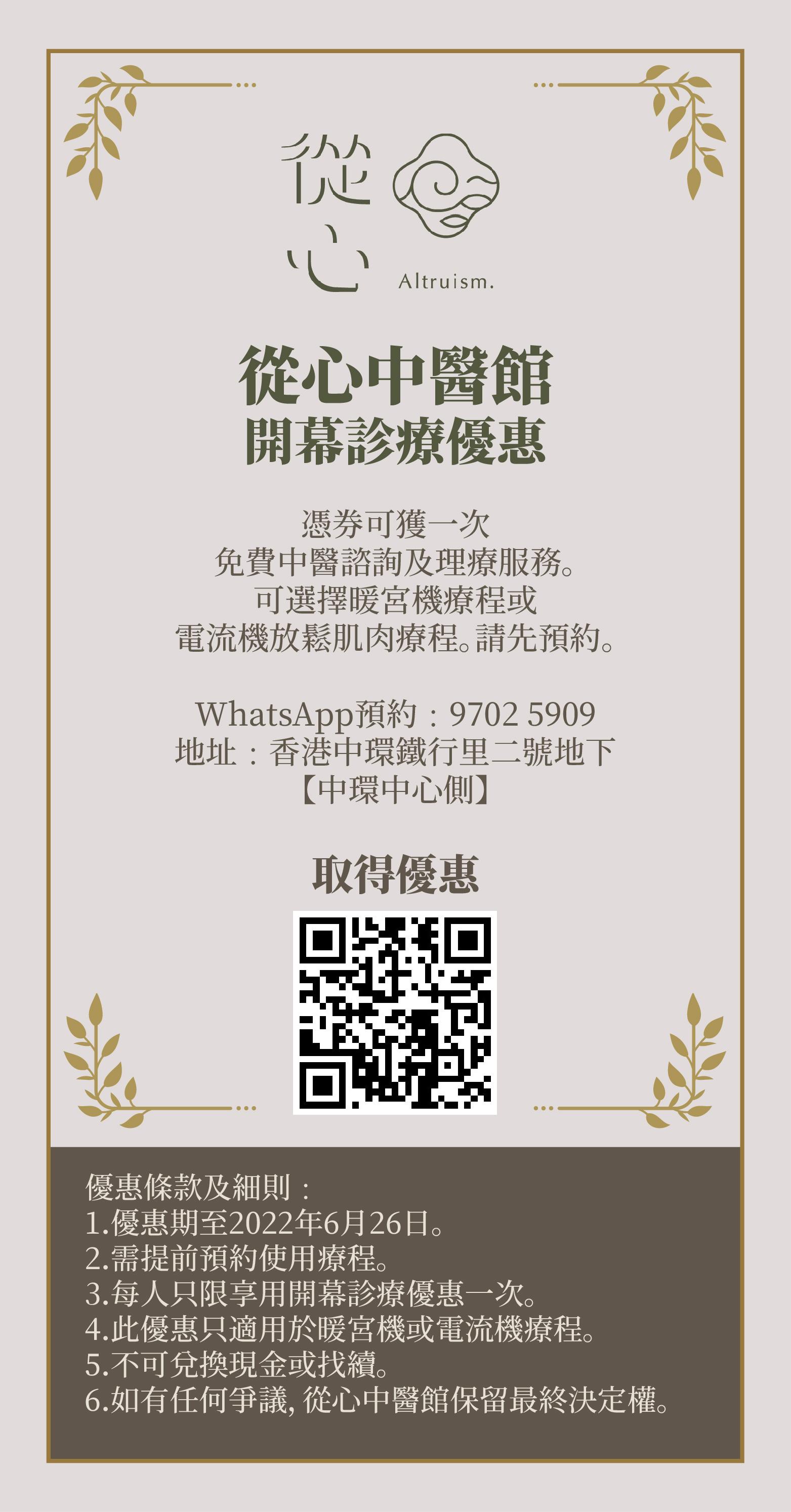 醫館新張期內,憑開幕診療優惠券,可免費享用一次中醫諮詢及理療服務(暖宮機或電流機理療)。