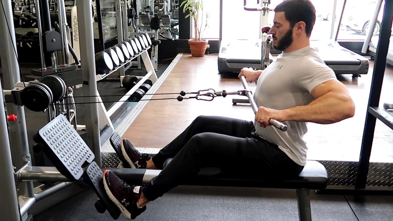 - 坐於鋼線划船器械上,調整合適重量(約6至10RM),雙手握住把手約1.5倍肩闊。雙腳踩住踏板,撐直至膝蓋微曲,期間腰脊保持挺直、收腹,避免受傷。
