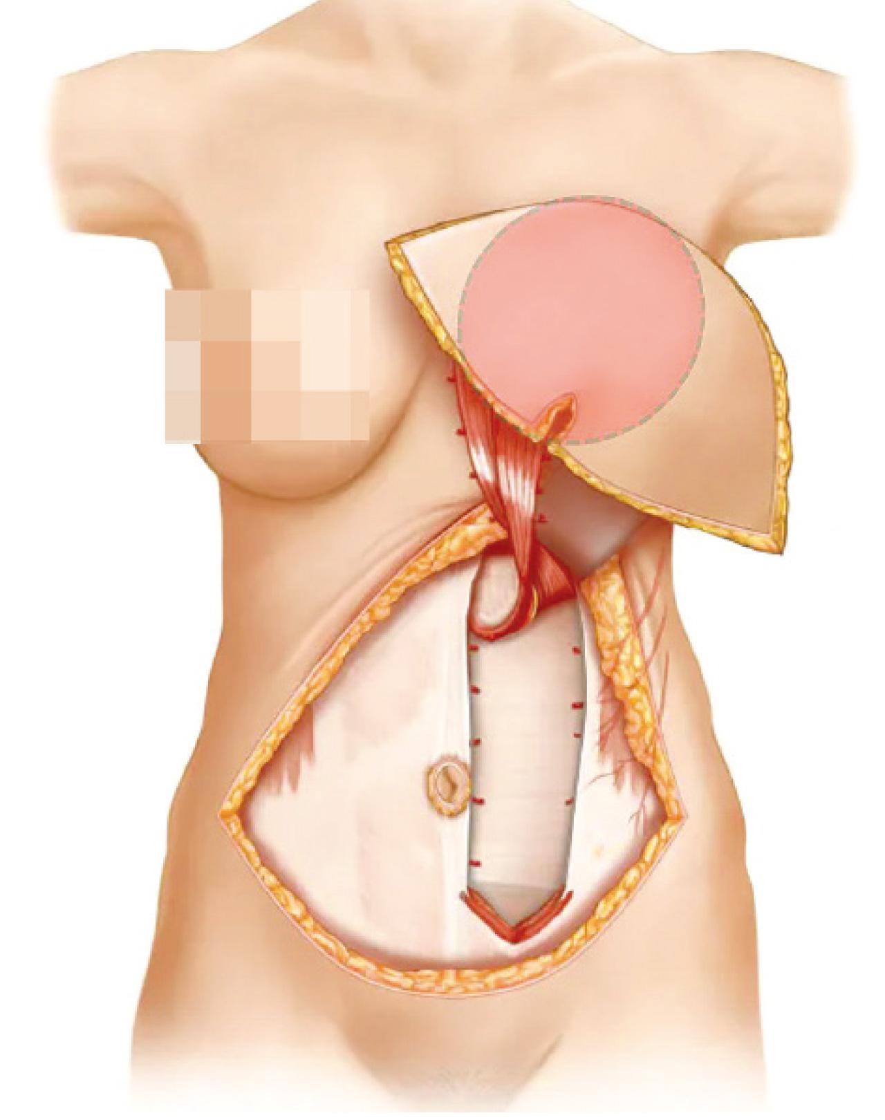 「帶蒂式皮瓣」重建方法,將組織經皮下,移至胸部。