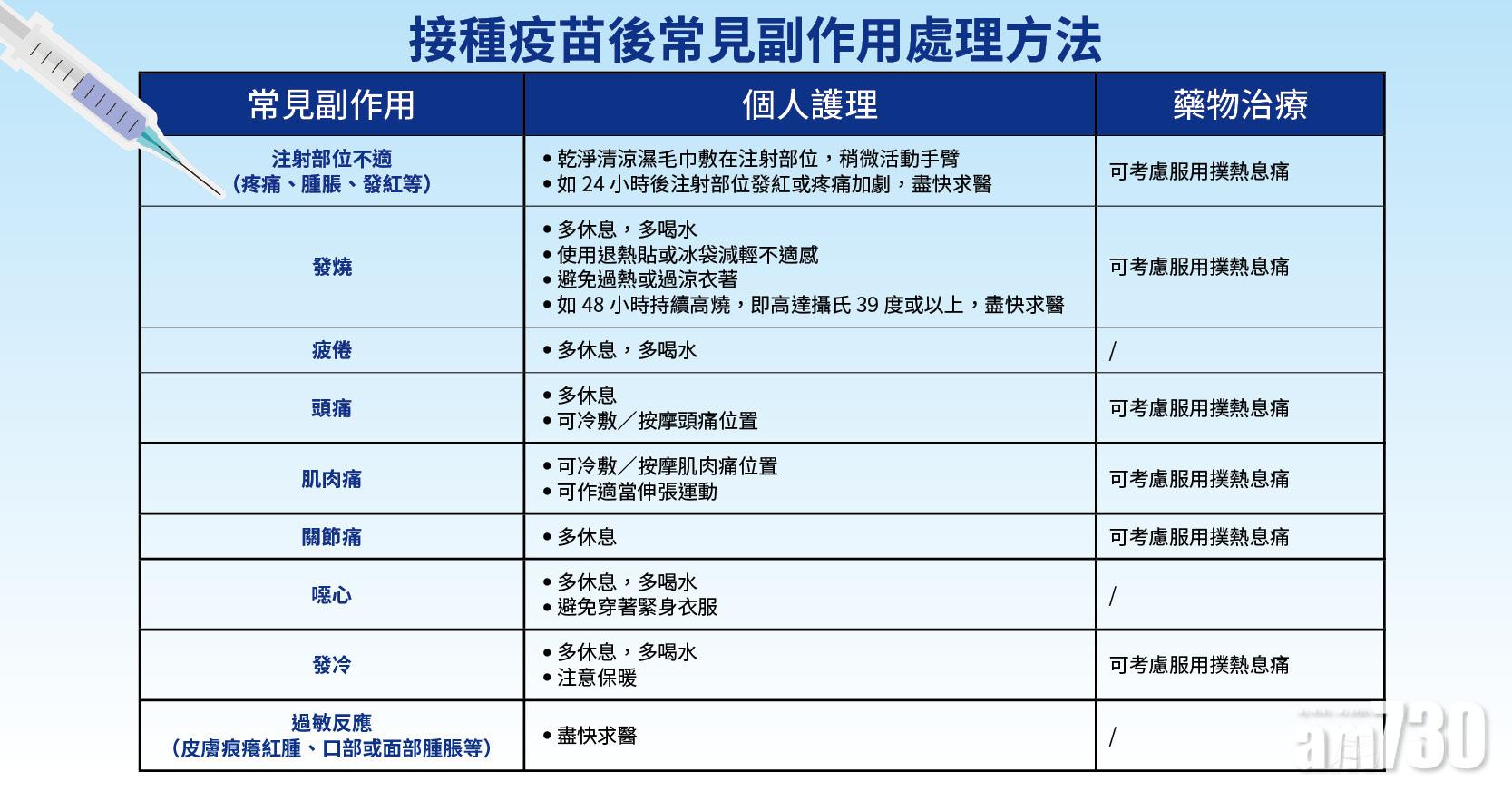 而根據世界衛生組織的指引,接種新冠疫苗後出現副作用屬正常現象。常見的疫苗副作用包括注射部位疼痛腫脹、發燒、疲倦、頭痛、肌肉痛及關節痛等,一般而言,這些副作用通常較為輕微及短暫,可以透過多加休息及多喝清水解決,世衛亦建議接種人士可考慮服食撲熱息痛,紓緩部分疫苗常見副作用引致的不適。若接種24小時後注射部位發紅或疼痛加劇、48小時持續高燒達39度或以上,甚或出現嚴重過敏反應等,就要盡快求醫。選購止痛藥時,記得必須查看產品包裝,請於使用前詳閱產品標籤說明,長期病患或正在服用藥物人士,須於自行服用止痛藥前,先咨詢醫生意見。