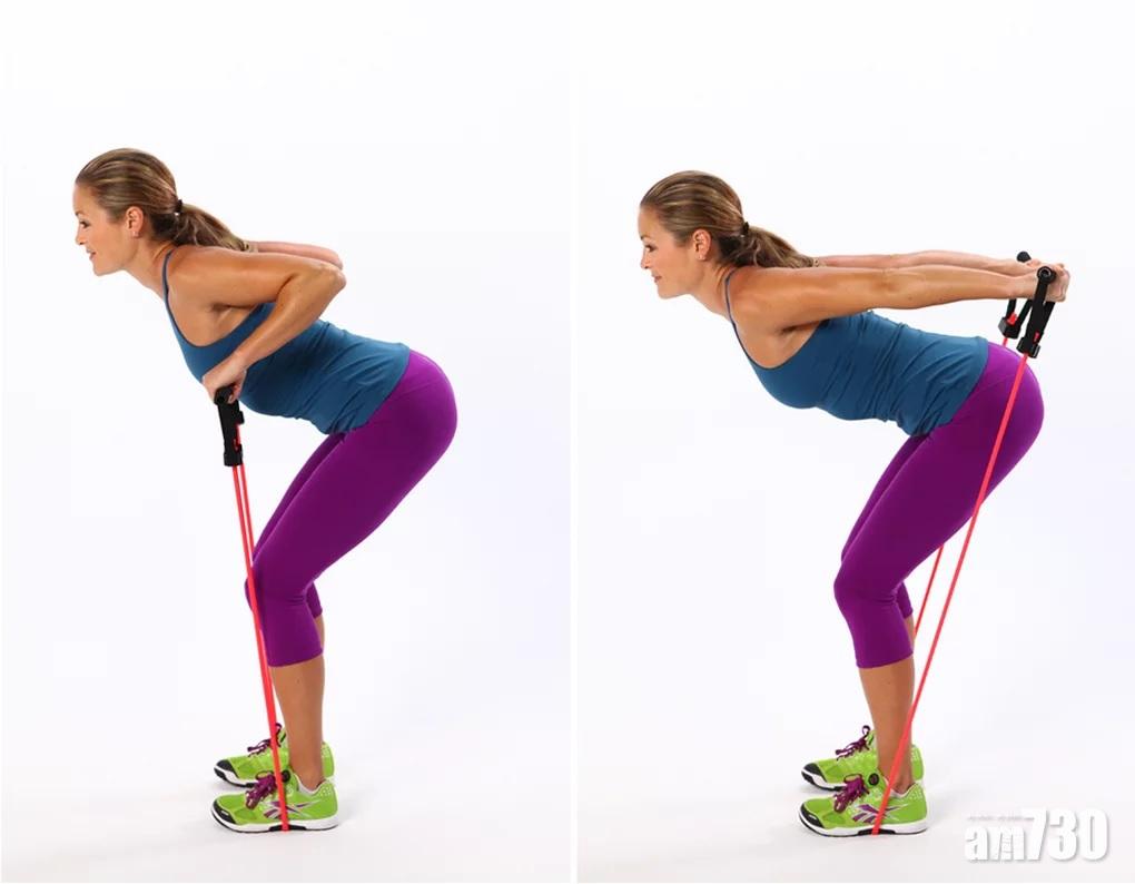 - 採站姿,雙手執橡筋帶兩端,中間用腳踏住並調節適當長度。